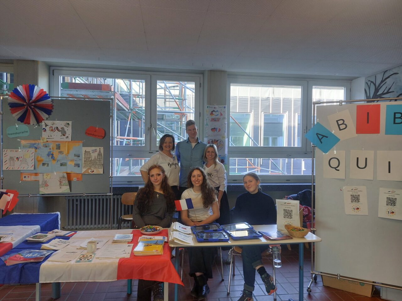 Die Fachschaft Französisch hat am Tag der offenen Tür in diesem Jahr ein besonders vielfältiges Angebot präsentiert. An einem Informationsstand konnten sich Schülerinnen, Schüler und Eltern der 4. Klassen über Französisch als erste oder zweite Fremdsprache informieren. Besonders im Fokus stand dabei das AbiBac-Programm, das den gleichzeitigen Erwerb des deutschen und französischen Abiturs an unserer Schule ermöglicht. Unterstützt wurden Frau Spreider, Frau Giesl und Herr Hacker tatkräftig von drei Schülerinnen, die in diesem Schuljahr selbst das AbiBac ablegen werden und somit aus erster Hand über ihre Erfahrungen berichten konnten.