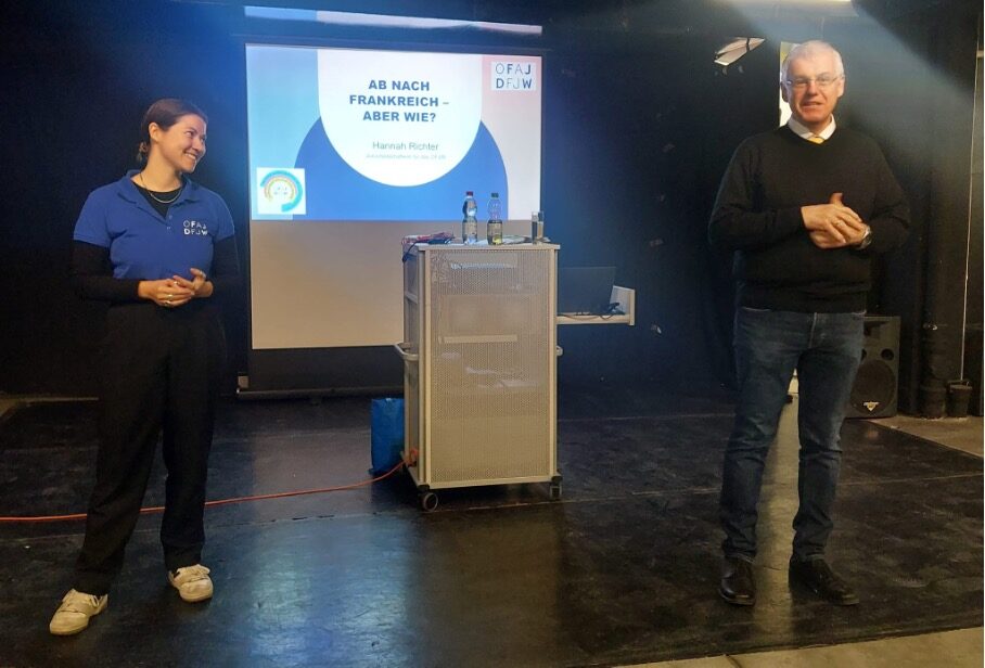 Im Mittelpunkt des Vortrags standen die Angebote des Deutsch-Französischen Jugendwerks, kurz DFJW, auf Französisch OFAJ. Vorgestellt wurden unter anderem der Deutsch-Französische Freiwilligendienst, verschiedene Praktikumsmöglichkeiten sowie die finanzielle und organisatorische Unterstützung für individuelle Projekte im französischen Ausland. Besonders spannend für viele war auch die Information, dass interessierte Jugendliche selbst Juniorbotschafter oder Juniorbotschafterin werden und so aktiv zum deutsch-französischen Austausch beitragen können.