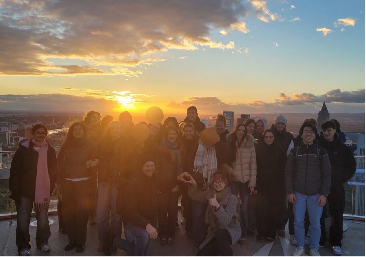 Unsere Reise begann am Montag mit der Zugfahrt nach Frankfurt, die zum Glück reibungslos verlief. Dort angekommen trafen wir die französischen Schülerinnen und Schüler und konnten am Nachmittag dank der “Skyline-Tour – unterwegs in Mainhattan” Frankfurt entdecken. Sie führte uns durch die Frankfurter Innenstadt, das Bankenviertel und endete mit dem Highlight der Tour: dem Besuch der Aussichtsplattform auf dem Maintower auf 200m Höhe. Während der Führung wurden wir darauf hingewiesen, dass sich Bundeskanzler Friedrich Merz gerade im Luxushotel “Frankfurter Hof” neben uns aufhielt. Ein Teil der Gruppe sah ihn zu einem späteren Zeitpunkt sogar vor dem Hotel in ein Auto steigen.