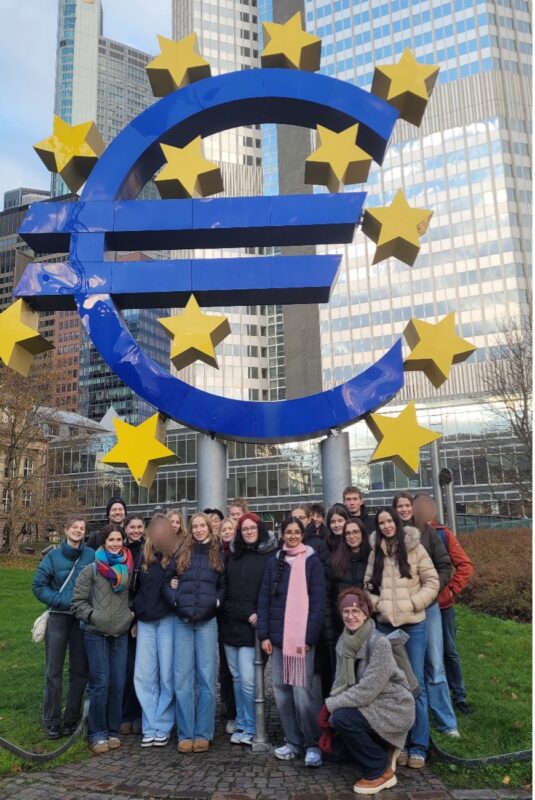 Unsere Reise begann am Montag mit der Zugfahrt nach Frankfurt, die zum Glück reibungslos verlief. Dort angekommen trafen wir die französischen Schülerinnen und Schüler und konnten am Nachmittag dank der “Skyline-Tour – unterwegs in Mainhattan” Frankfurt entdecken. Sie führte uns durch die Frankfurter Innenstadt, das Bankenviertel und endete mit dem Highlight der Tour: dem Besuch der Aussichtsplattform auf dem Maintower auf 200m Höhe. Während der Führung wurden wir darauf hingewiesen, dass sich Bundeskanzler Friedrich Merz gerade im Luxushotel “Frankfurter Hof” neben uns aufhielt. Ein Teil der Gruppe sah ihn zu einem späteren Zeitpunkt sogar vor dem Hotel in ein Auto steigen.