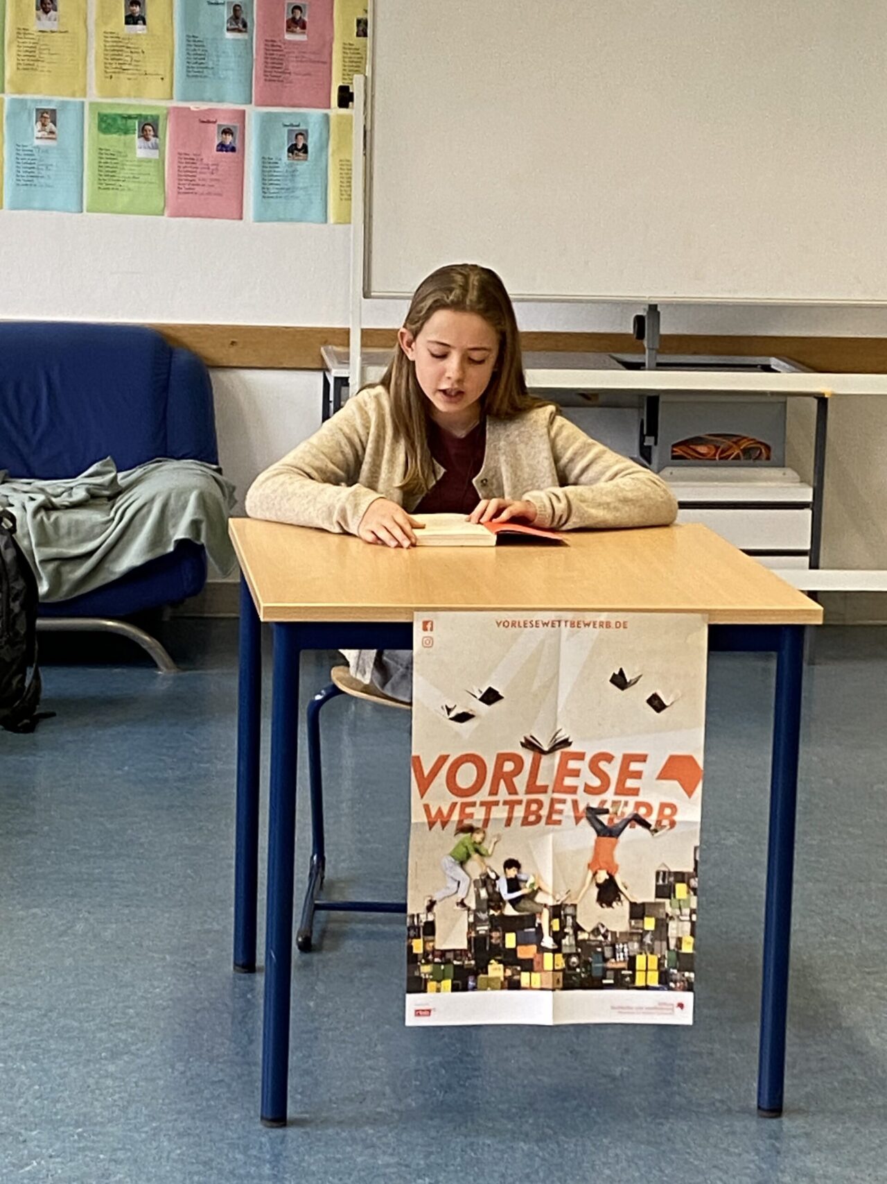 Am 28.11.2025 fand an unserer Schule in der 5. und 6. Stunde der Vorlesewettbewerb der 6. Klassen statt, bei dem die Vorlese-Siegerinnen und -Sieger aus den einzelnen Klassen gegeneinander antraten. Bundesweit beteiligen sich an diesem Wettbewerb des Deutschen Buchhandels, den es seit 1959 gibt und der unter der Schirmherrschaft des Bundespräsidenten steht, rund 600.000 Schülerinnen und Schüler. Unsere Jury bestand aus drei Lehrkräften (Frau Jäger, Frau Färber-Stier und Frau Steinbach) und zwei Q12-Schülern (Tim und Diego). Die Begrüßung übernahm Herr Anthofer und erzählte den Kindern unter anderem von seiner Begeisterung für das Lesen. Die Klassensiegerinnen und -sieger sind Lilia Schneider (6a), Emma Czeck (6b), Samuel Carvello (6c), Florentina Groß (6d) und Serhii Troianskyi (6e). Jeder durfte vier “Unterstützer” aus seiner Klasse mitbringen und das Publikum lauschte konzentriert und interessiert den Vorträgen. Vorgelesen wurde aus den Büchern „Luftmaschentage“ von Anne Becker, „Wie der Wahnsinn mir die Welt erklärte“ von Dita Zipfel, „Percy Jackson, Diebe im Olymp“ von Rick Riordan, „Vorstadtkrokodile“ von Max von der Grün und „Die Piraten von Darksea“ von Catherine Doyle. Die Entscheidung fiel der Jury sehr schwer. Siegerin – und damit Vertreterin unserer Schule beim Stadtentscheid – wurde mit einem sehr schönen Vortrag Emma Czech (6b). Als Preise durften sich alle Klassensiegerinnen und -sieger Bücher aussuchen.