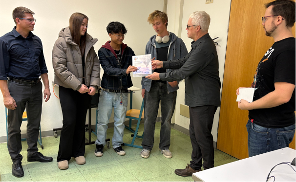 Herr Dr. Stephan Giglberger und Herr Dr. Markus Huber von der Universität Regensburg Fachbereich Physik, besuchten die Klasse 11b, um ihnen eine Urkunde und eine Anerkennung zu überreichen. Auch der ständige Stellvertreter des WvSG Markus Anthofer gratulierte der Klasse persönlich.